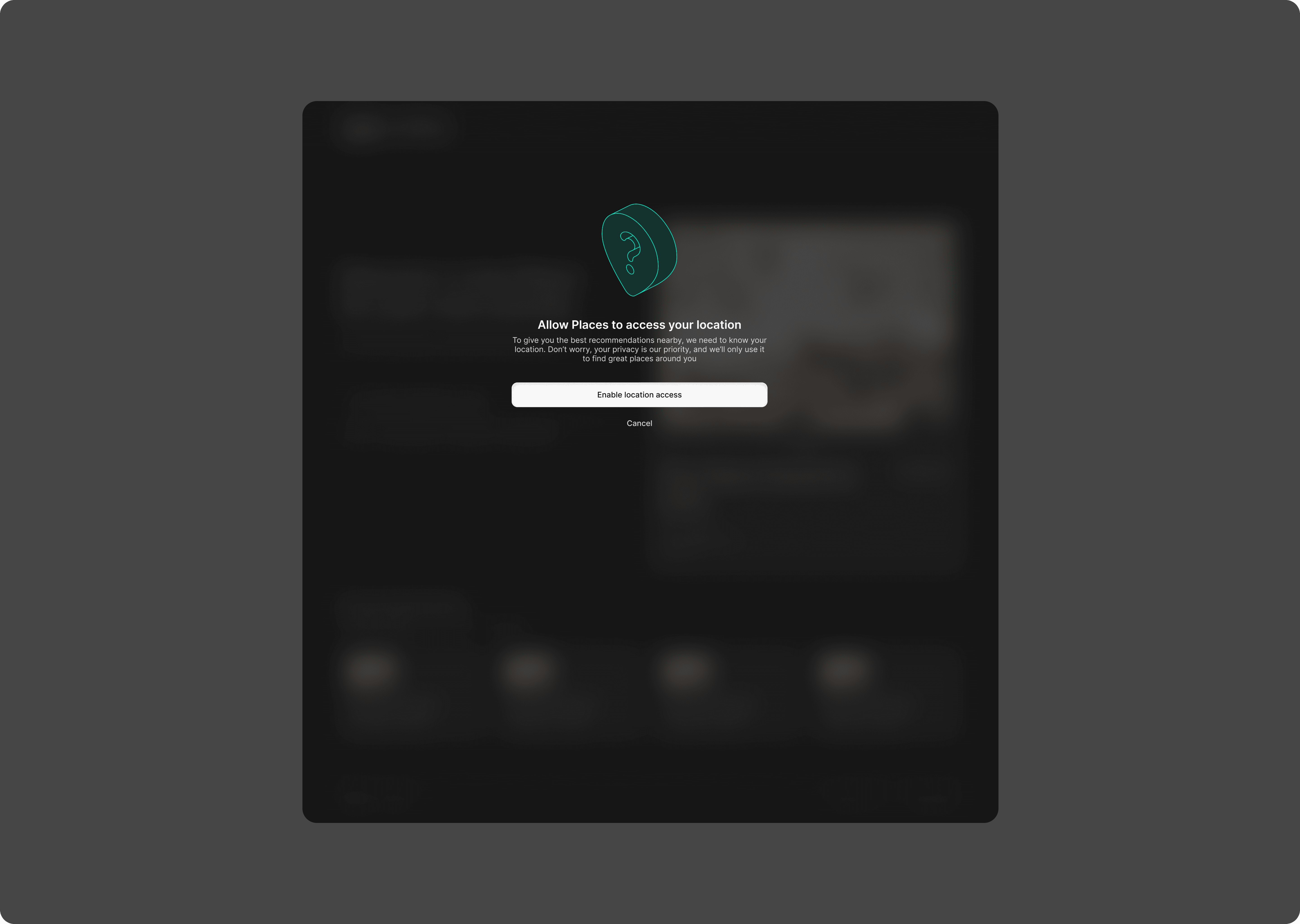 A transparent and reassuring screen asks users to enable location access to provide personalized recommendations.Search Interface