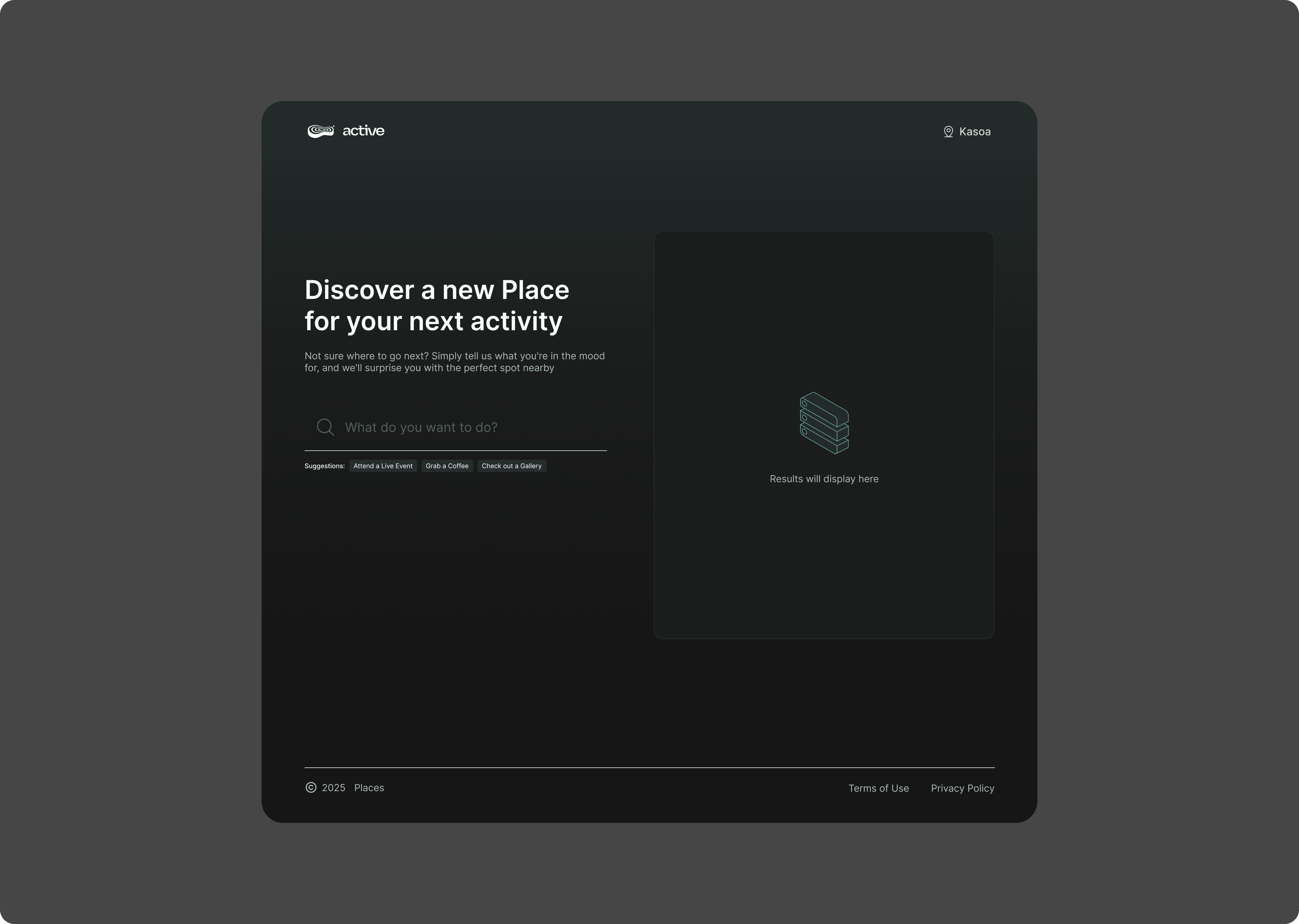 A straightforward search bar with activity suggestions like “Coworking space” or “Grab a coffee” for convenience.Recommendations & Results